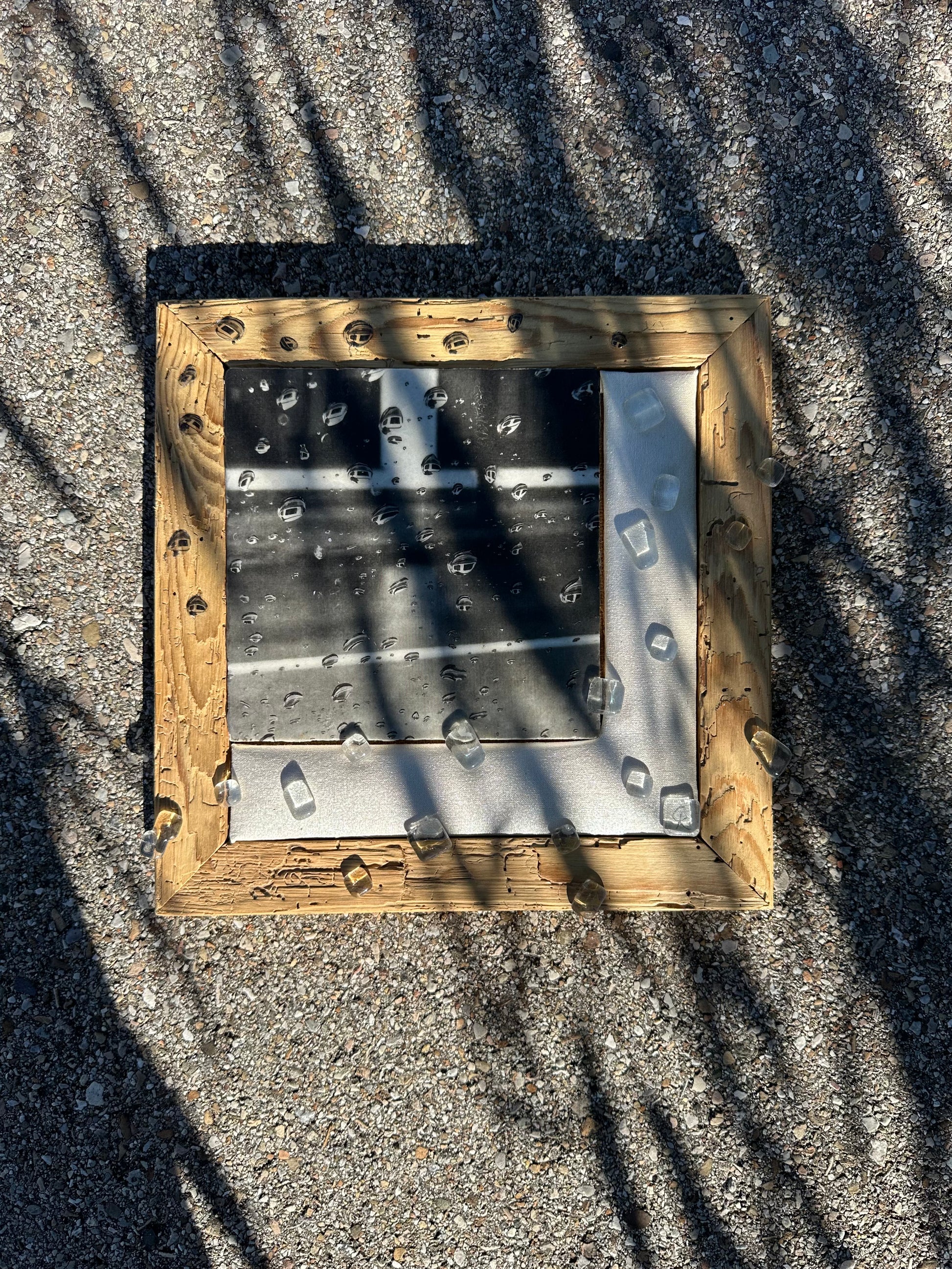 Beide Elemente schmiegen sich in einem Altholzrahmen, der im Chiemgau handgefertigt wurde. Auf auf diesen Rahmen wurden mit Hilfe der Fototransfertechnik einzelne "Regentropfen" übertragen, so verschmelzen Rahmen und Fotografie miteinander.