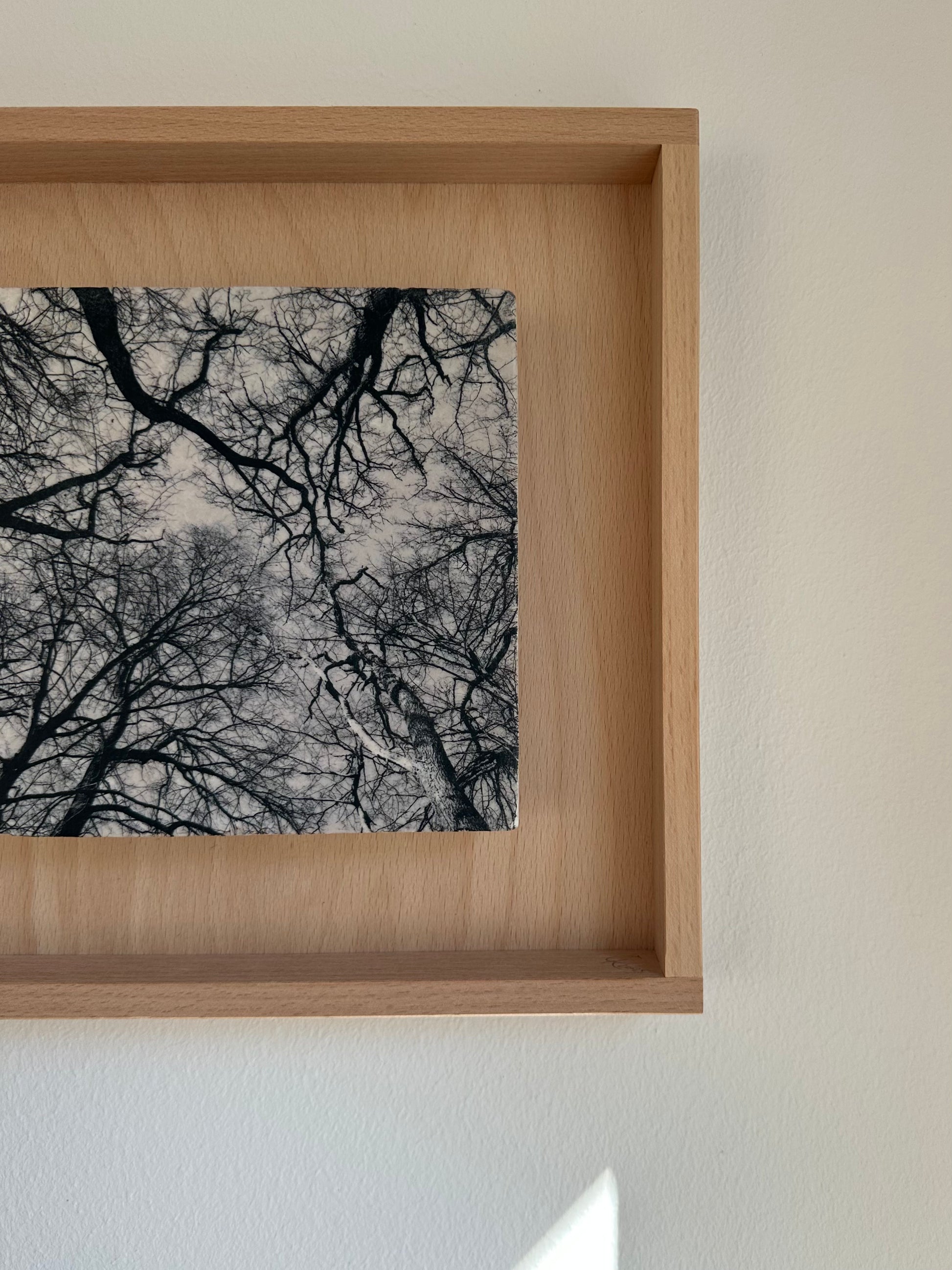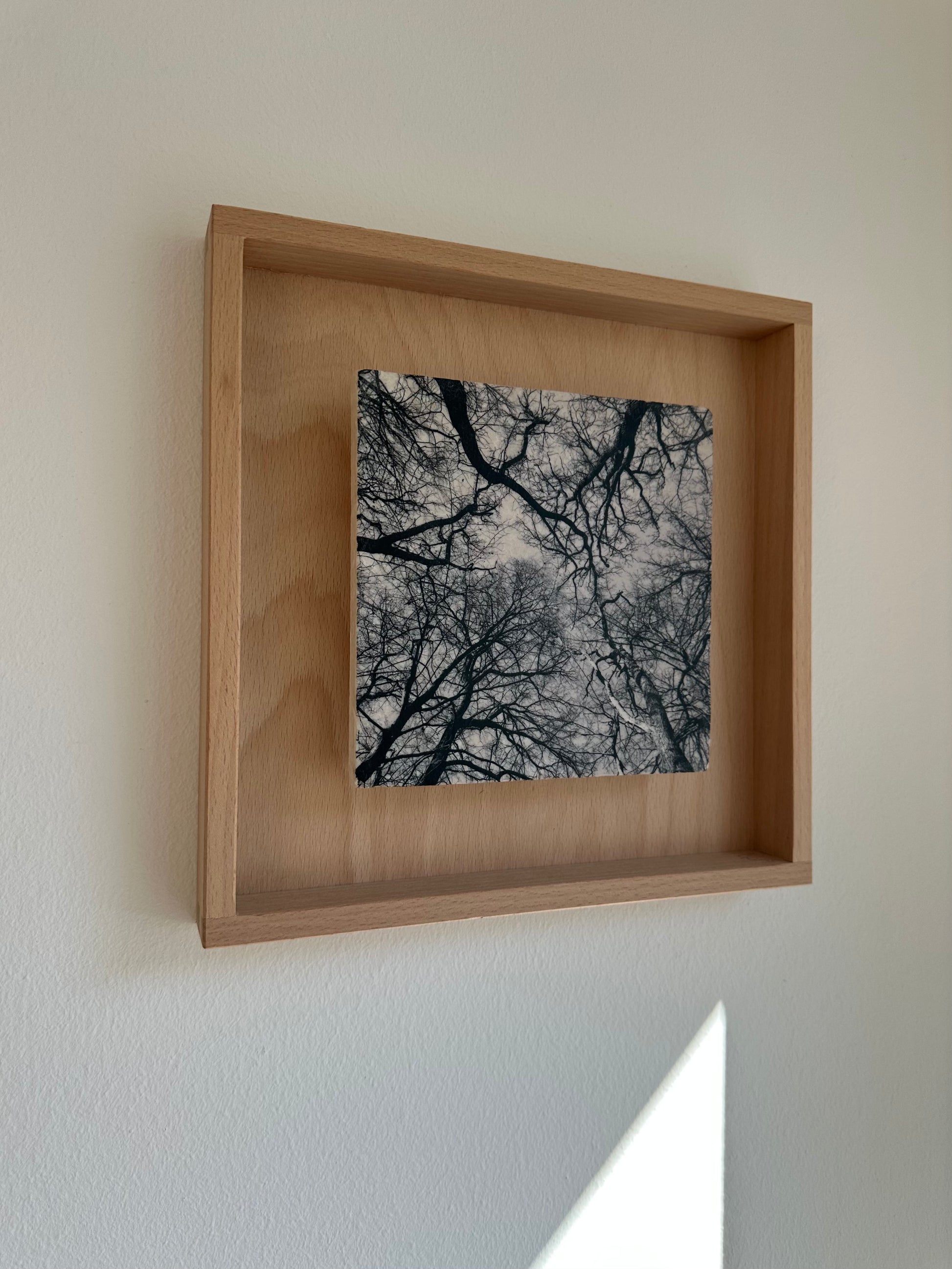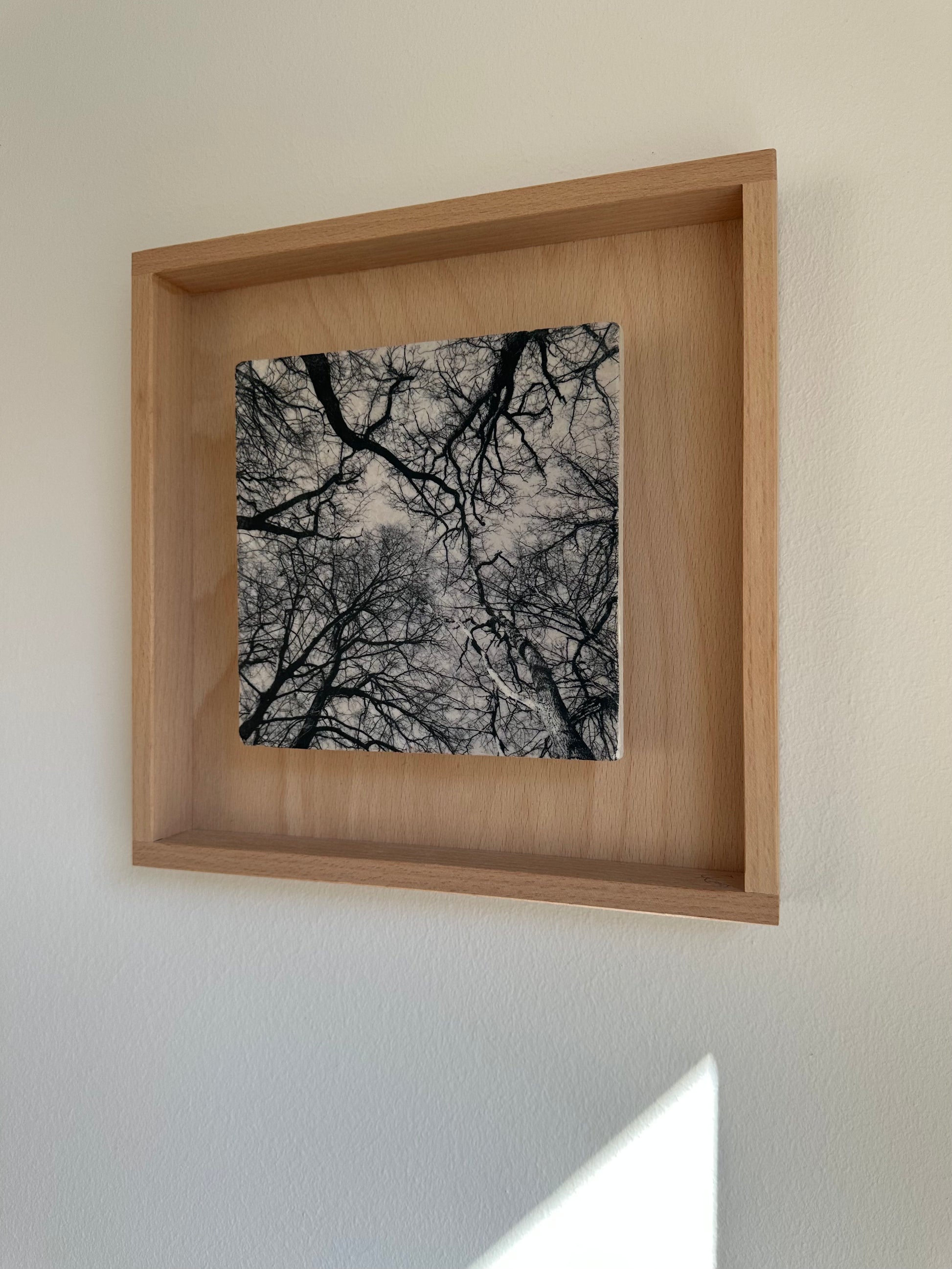 Die Aufnahme wurde mit Hilfe der Fototransfertechnik per Hand auf eine Travertin-Natursteinfliese übertragen und anschließend lackiert. Der Objektrahmen aus massiver Buche lässt sie förmlich schweben.