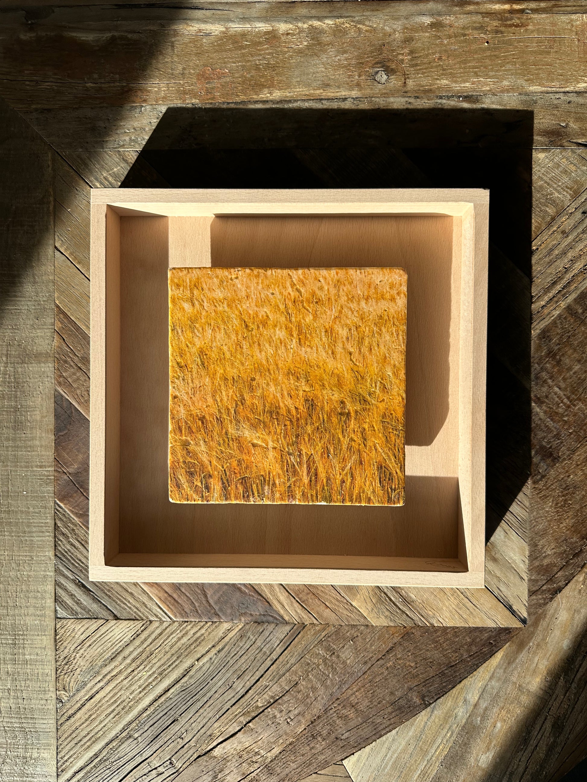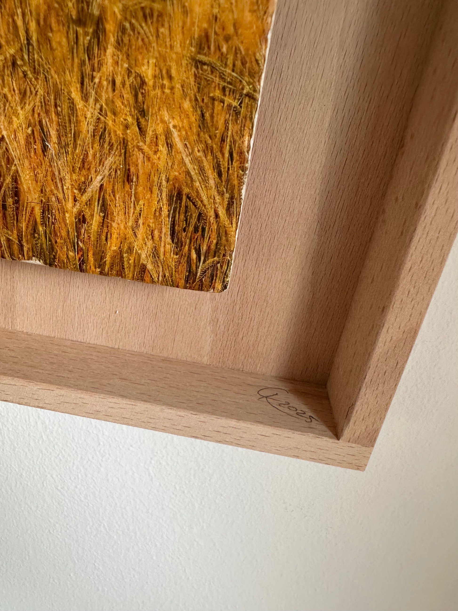 Die Aufnahme wurde mit Hilfe der Fototransfertechnik per Hand auf eine Travertin-Natursteinfliese übertragen und anschließend lackiert. Der Objektrahmen aus massiver Buche lässt sie förmlich schweben.