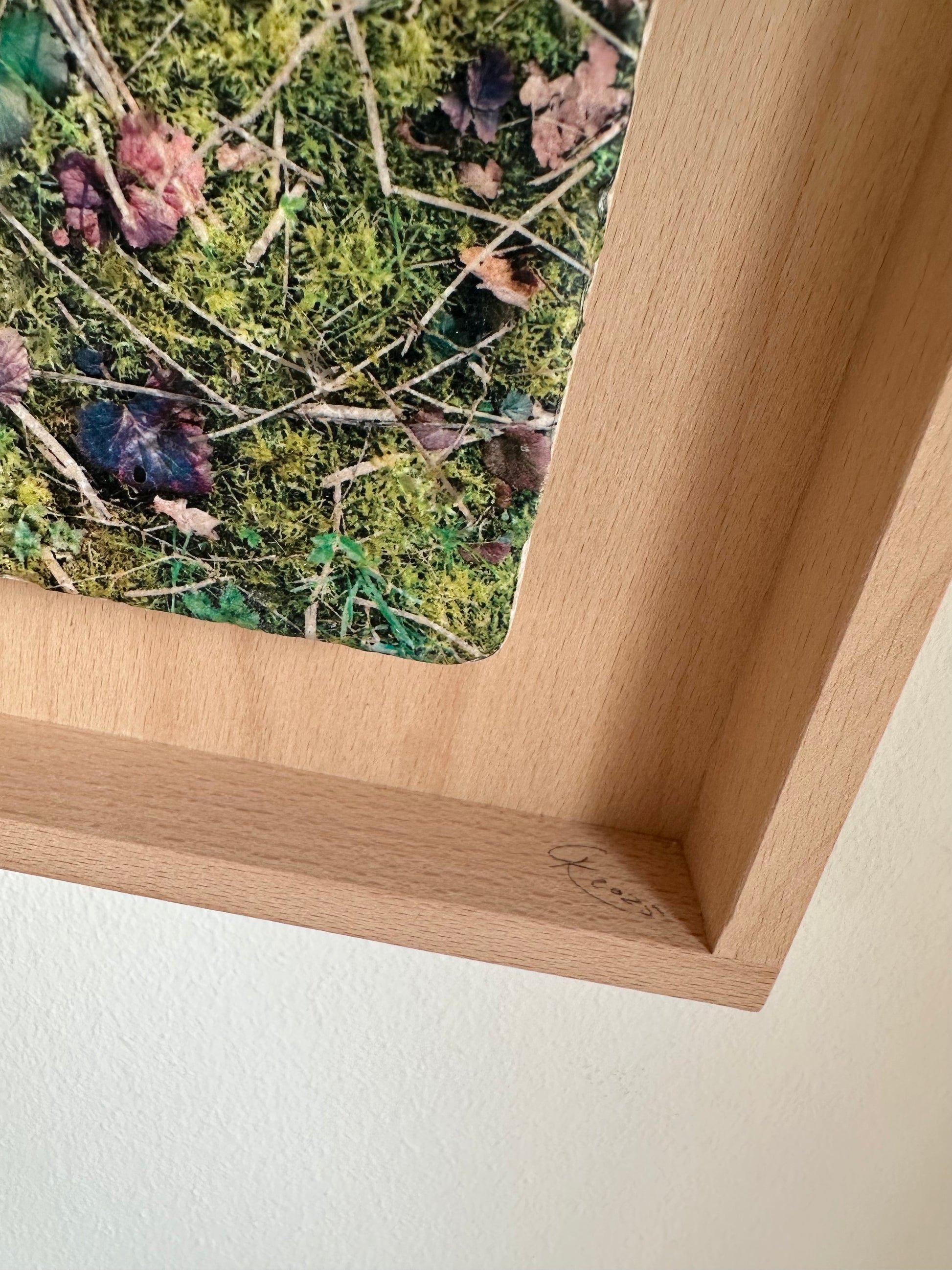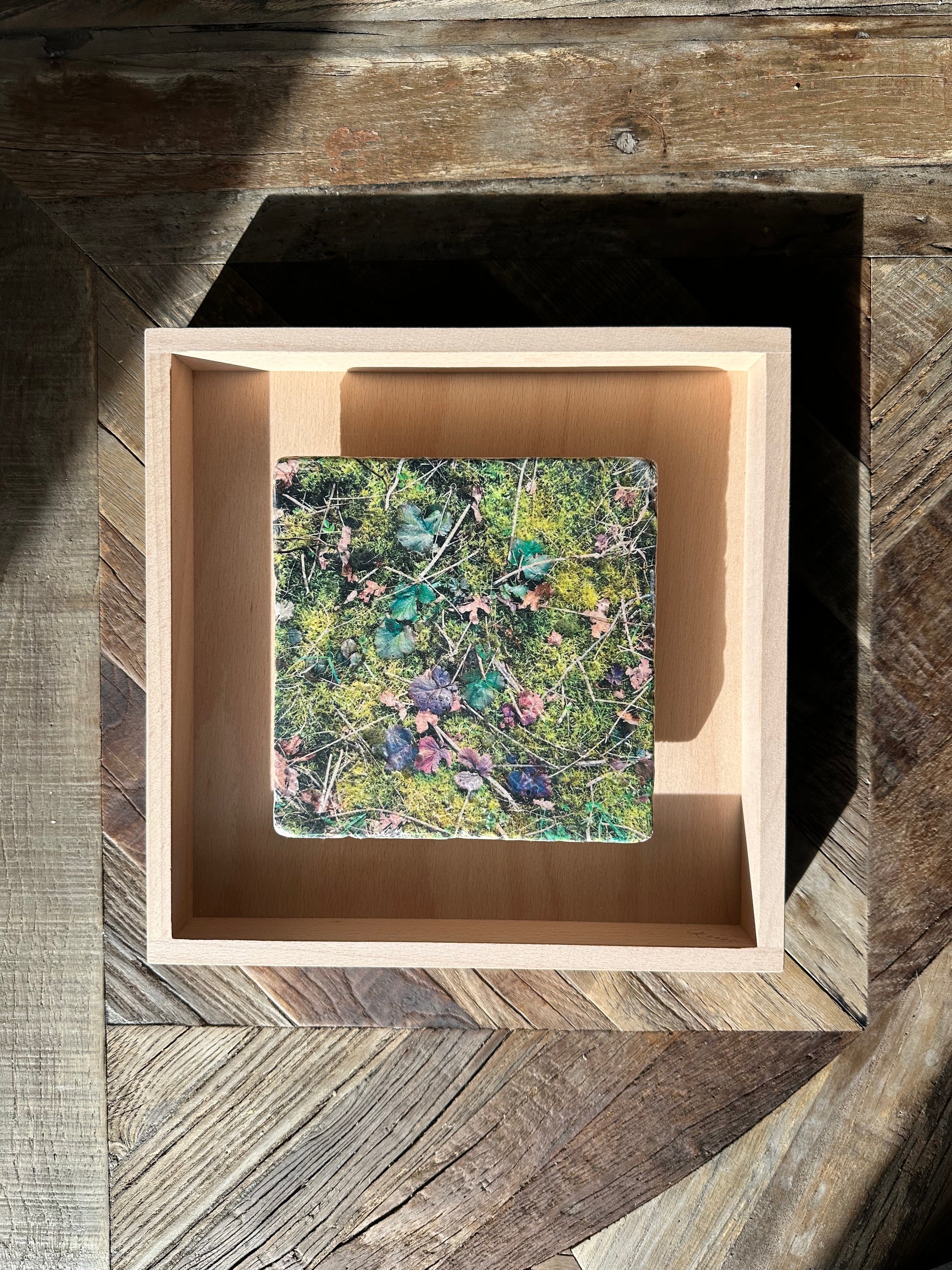 Die Aufnahme wurde mit Hilfe der Fototransfertechnik per Hand auf eine Travertin-Natursteinfliese übertragen und anschließend lackiert. Der Objektrahmen aus massiver Buche lässt sie förmlich schweben.