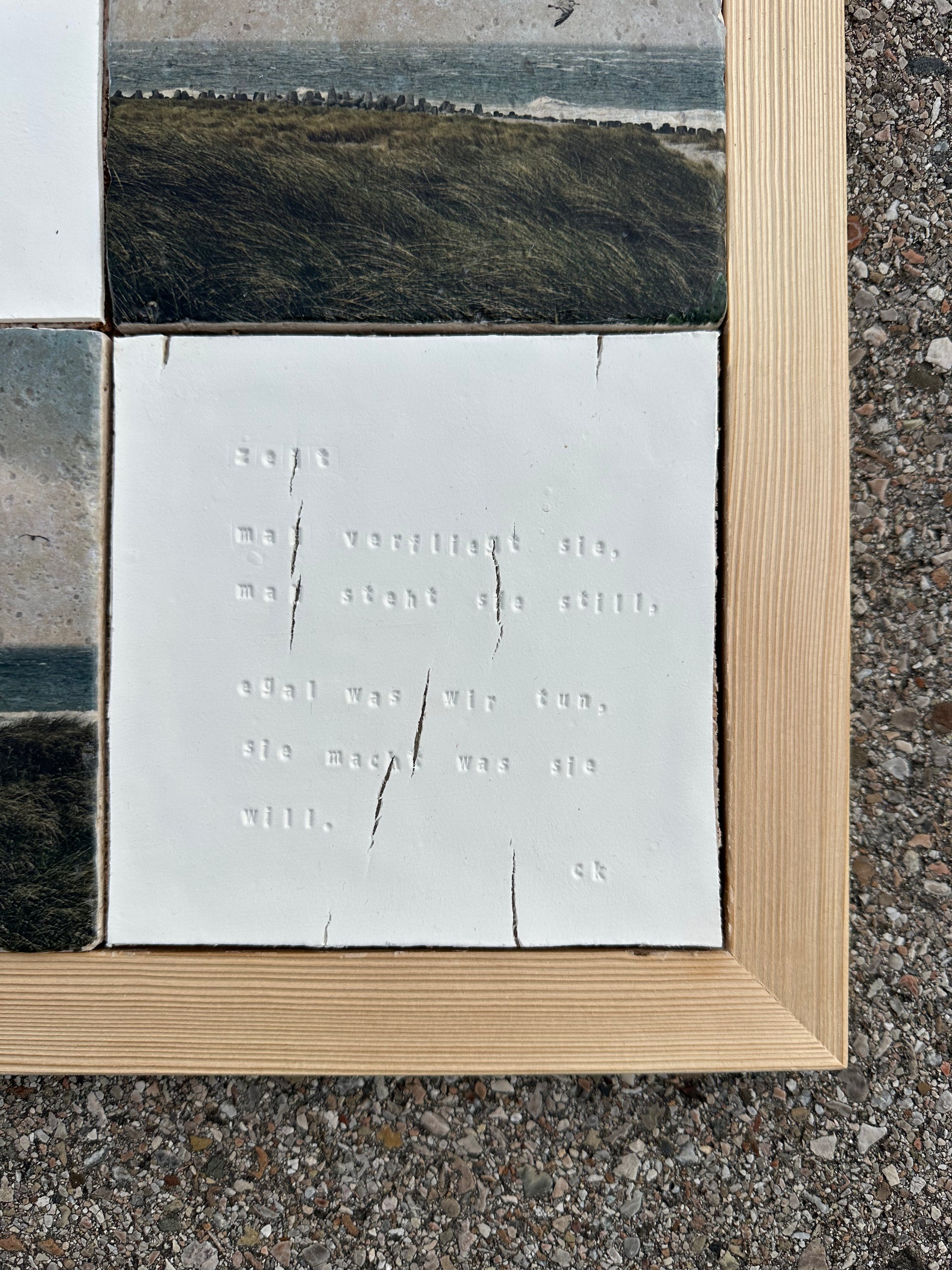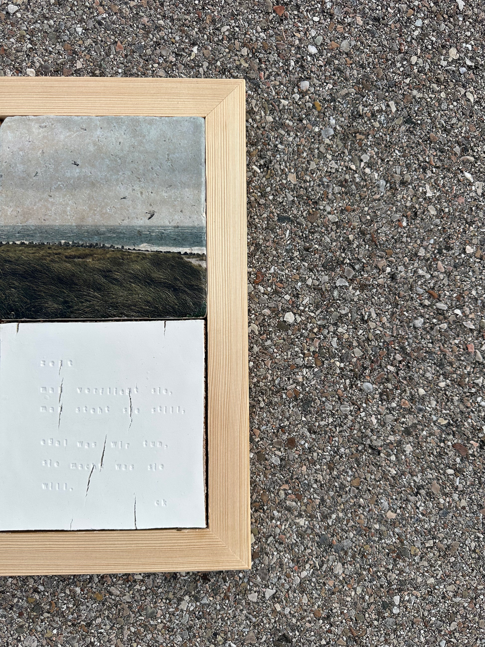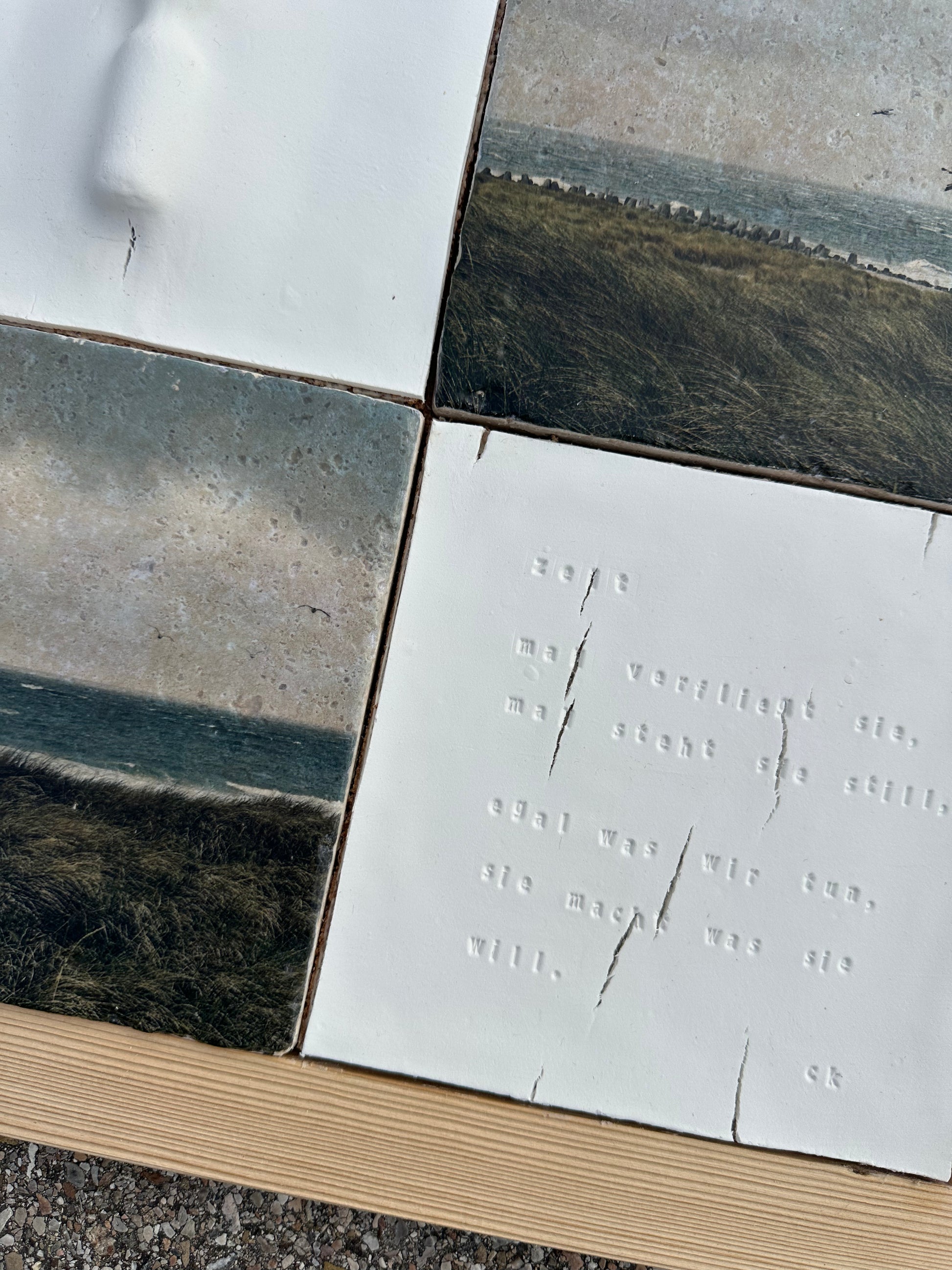 Wie fast alle meiner Fotografien entstanden auch diese hier auf einem Spaziergang mit meiner Hündin Fauna - dieses Mal auf der wunderschönen Insel Sylt. Die Aufnahmen wurden mit Hilfe der Fototransfertechnik per Hand auf Travertin-Natursteinfliesen übertragen und anschließend lackiert.